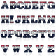 A full set of embroidered alphabet patches featuring bold letters with a sporty, collegiate style. Each letter has a navy blue background with a red and white outlined pattern resembling varsity jacket lettering.